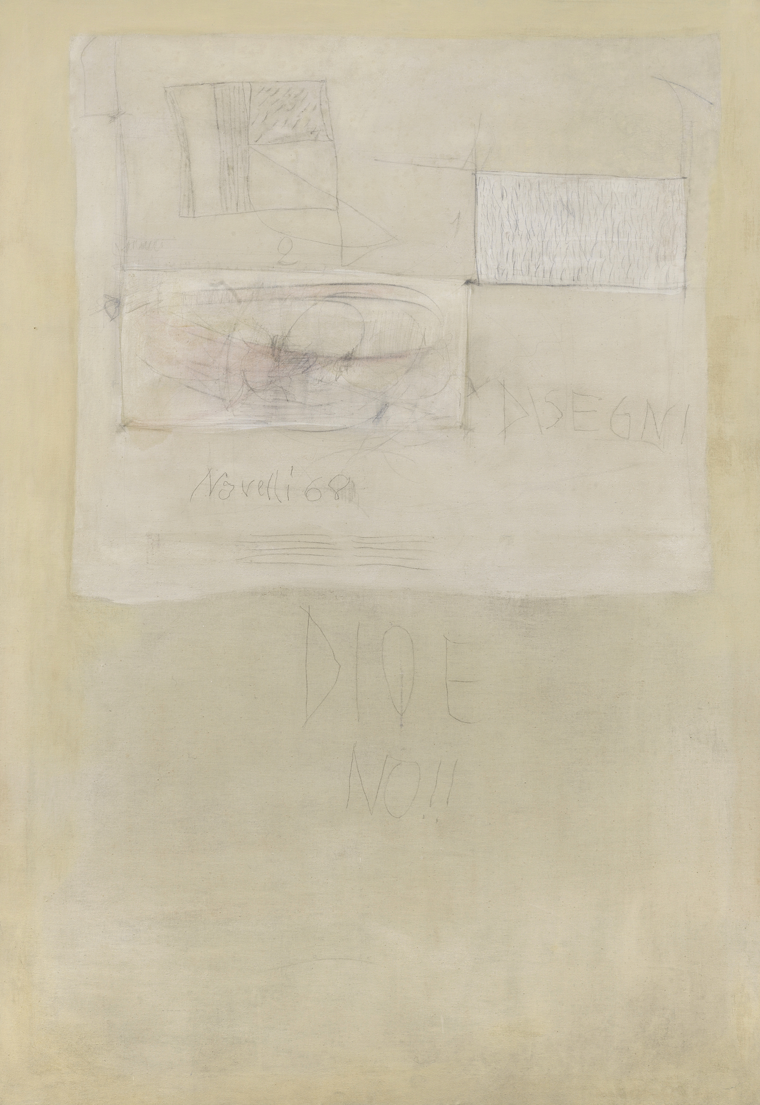Novelli voyage fréquemment en France, aux États-Unis, en Grèce et en Turquie et organise des expositions personnelles en Italie et à l’étranger. Entre-temps, son travail commence à aller au-delà de l’Art Informel, avec l’apparition de signes et d’écriture dans son travail. Il commence également à collaborer avec des écrivains du néo-avantgarde italien, avec qui il partage le même intérêt pour l’expérimentation linguistique. En 1962, il conçoit et publie l’Antologia del possibile et en 1964, il devient l’un des fondateurs de la revue Grammatica.
