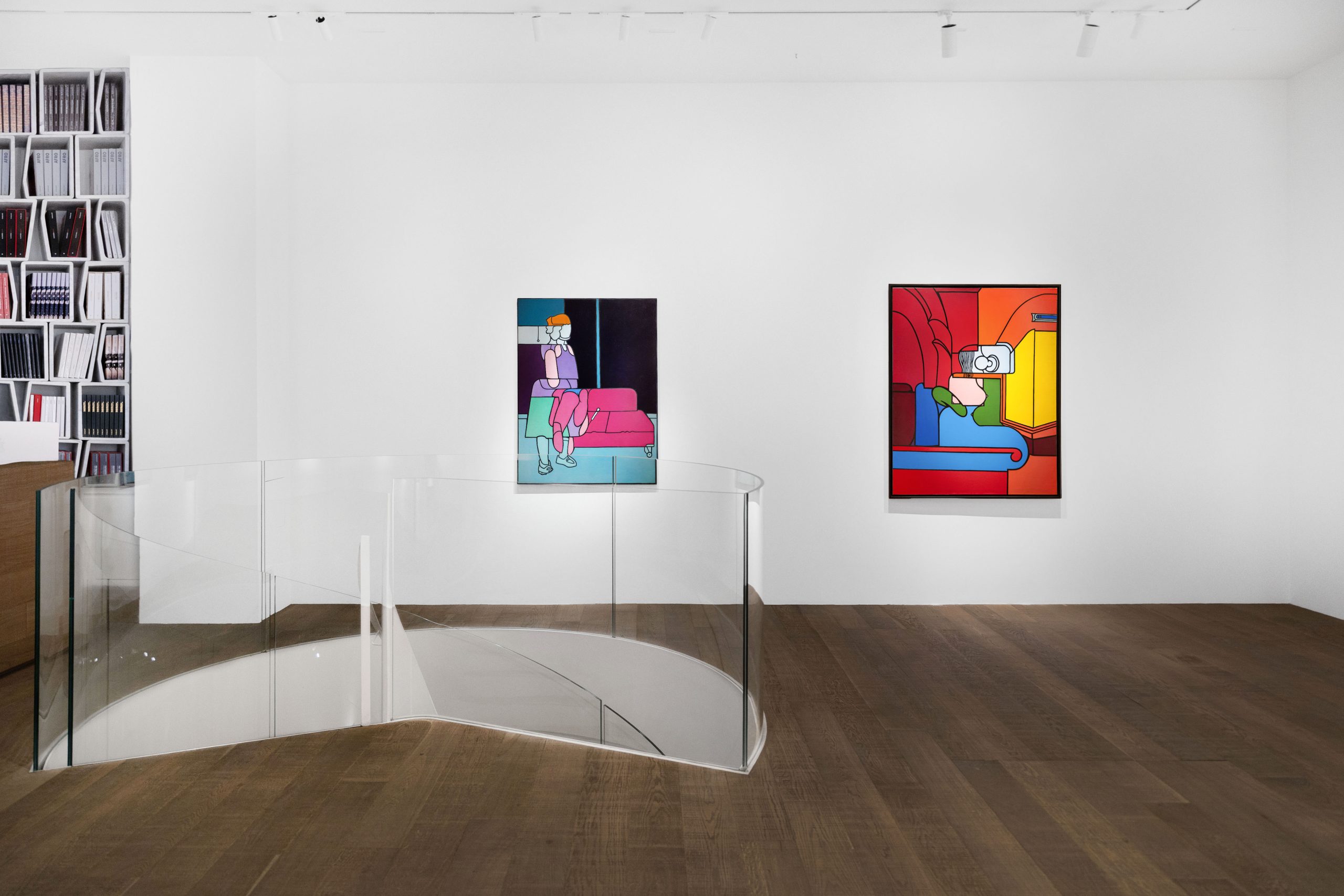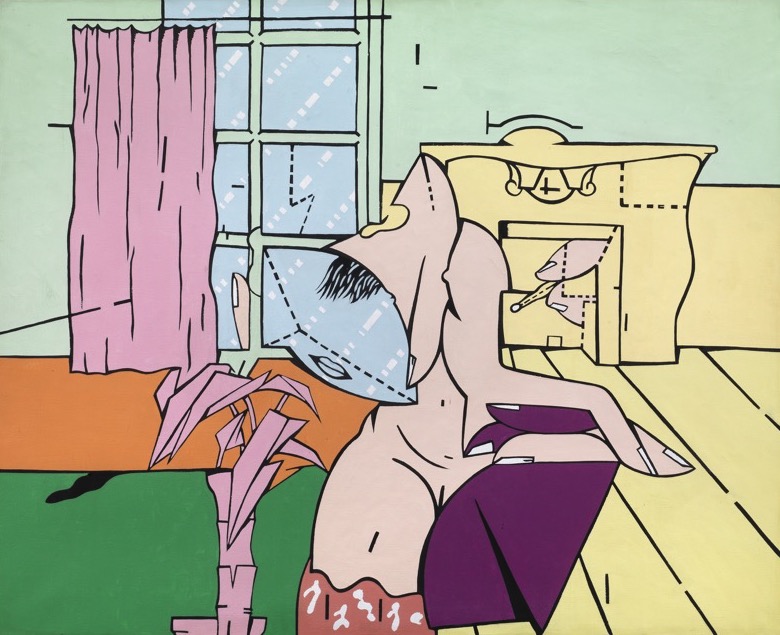 Au-delà de ses hommages à ses contemporains, l’œuvre d’Adami explore fréquemment des paysages, en particulier des « paysages intérieurs » représentant des chambres d’hôtel et des bars. Ces interni sont souvent peuplés de figures anonymes à divers stades de déconstruction, leurs récits empreints de tension par la présence subtile d’un second personnage ou par la suggestivité d’un titre soigneusement choisi. Dans The Bar (La lutte des sexes) n° 2 (2007), le titre évocateur fait référence à la « bataille des sexes », tandis que la figure centrale semble incarner plusieurs personnes. À l’inverse, Interno (1967) écarte totalement les figures humaines pour se concentrer sur l’anonymat austère d’une chambre d’hôtel. Réfléchissant sur sa fascination pour ces espaces de passage, Adami a un jour déclaré : « Pendant des années, j’ai peint dans des chambres d’hôtel. J’ai longtemps vécu une vie très nomade. J’avais besoin de l’anonymat d’un lieu de passage pour réinventer la possibilité d’un atelier, et ces voyages ne prenaient forme que lorsqu’ils apparaissaient sur l’horizontalité de la feuille de papier. »