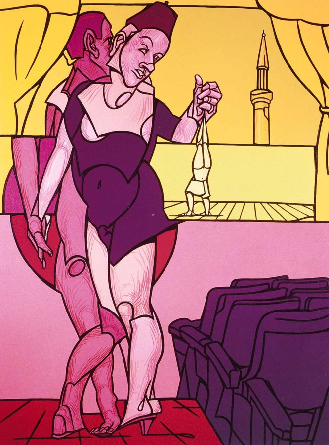 Les nombreux voyages d’Adami à travers l’Europe, les Amériques et l’Asie ont profondément influencé sa vision du monde et son expression artistique. Plongé dans des cultures variées, il a souvent intégré ces influences dans son œuvre. Scenografia con minareto (2000), par exemple, évoque ses voyages au Moyen-Orient à travers la représentation d’un minaret tout en faisant simultanément référence à l’un de ses thèmes récurrents : le théâtre. L’univers théâtral, apparu pour la première fois dans ses peintures dans les années 1960, est resté un fil conducteur tout au long de sa carrière. À partir de la fin des années 1970, ses œuvres puisent de plus en plus dans le monde gréco-romain, comme en témoigne Homère et son guide (1995). Ce tableau montre le poète grec Homère devant un temple, accompagné d’un berger, en hommage à un poème du poète français André Chénier, écrit au XVIIe siècle.