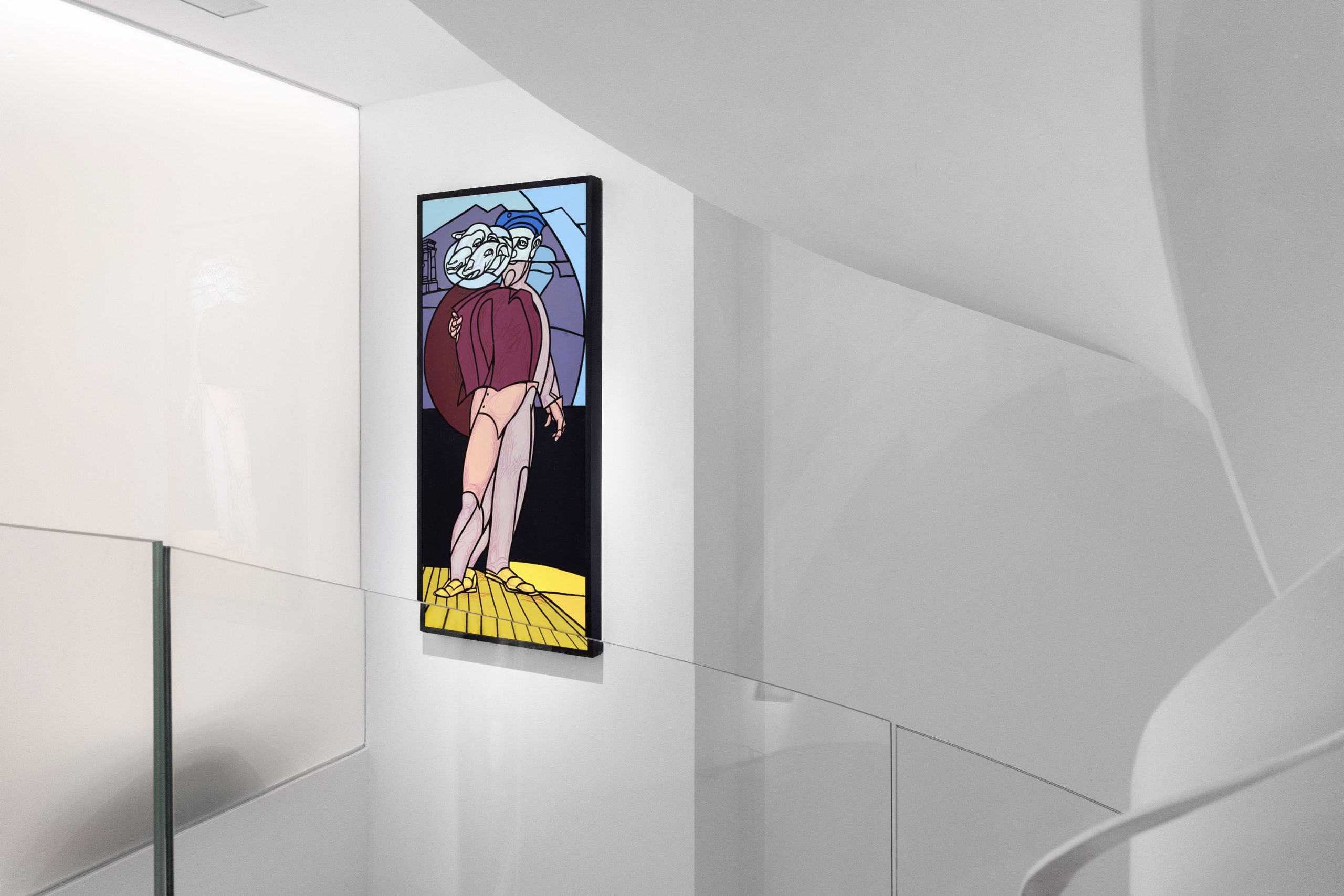 Ces couleurs sont encadrées dans des formes cernées qui évoquent la déconstruction du mouvement et des objets propre au cubisme et au futurisme. Cette approche est illustrée dans Fusione di una testa e di una finestra (omaggio a Boccioni) (1966), un hommage à une sculpture homonyme de l’artiste futuriste. S’inspirant de l’exploration de la démultiplication spatiale par Boccioni, Adami représente une figure nue fragmentée, invitant le spectateur à discerner des éléments tels que des mains, une bouche et une oreille. Durant les années 1960 et 1970, les contours d’Adami deviennent de plus en plus affirmés, comme dans Urlo di Munch (1971). Ici, il réinterprète le célèbre Cri, déconstruisant sa composition et transformant sa résonance émotionnelle grâce à une palette de roses et bleus pastel.